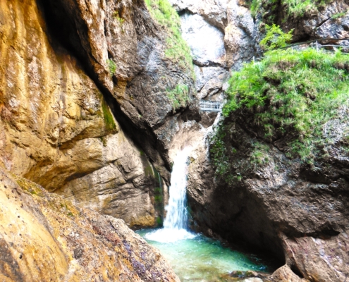 Wildromantische Schlucht am Fuße des Untersberg mit tosenden Wasserfällen, tiefen Gumpen und steilen Felswänden.